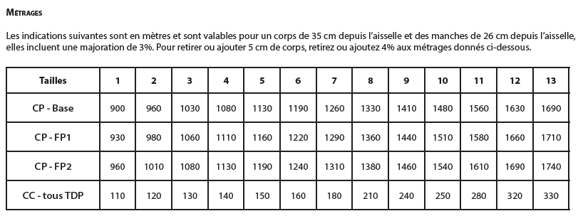 Référez-vous aux tableaux (photos 9 et 10) pour déterminer votre taille et le métrage nécessaire.